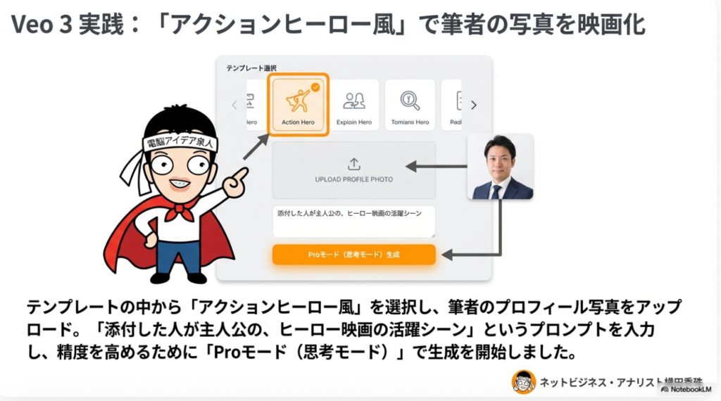 7:42 🦸 Veo3でアクションヒーロー風動画を生成
