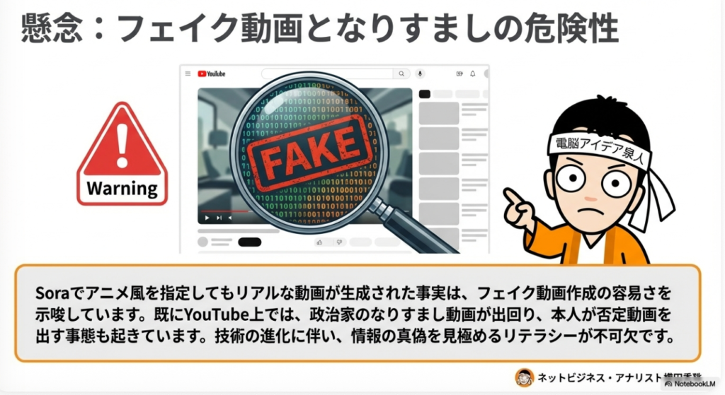 ⚠️ フェイク動画 実在の人物写真からリアルな動画を生成できるようになったことで、本人になりすました偽動画が容易に作れるリスクが高まっています。実際に政治家のなりすまし動画がSNSに投稿される事例も発生しており、社会的な問題として注目されています。