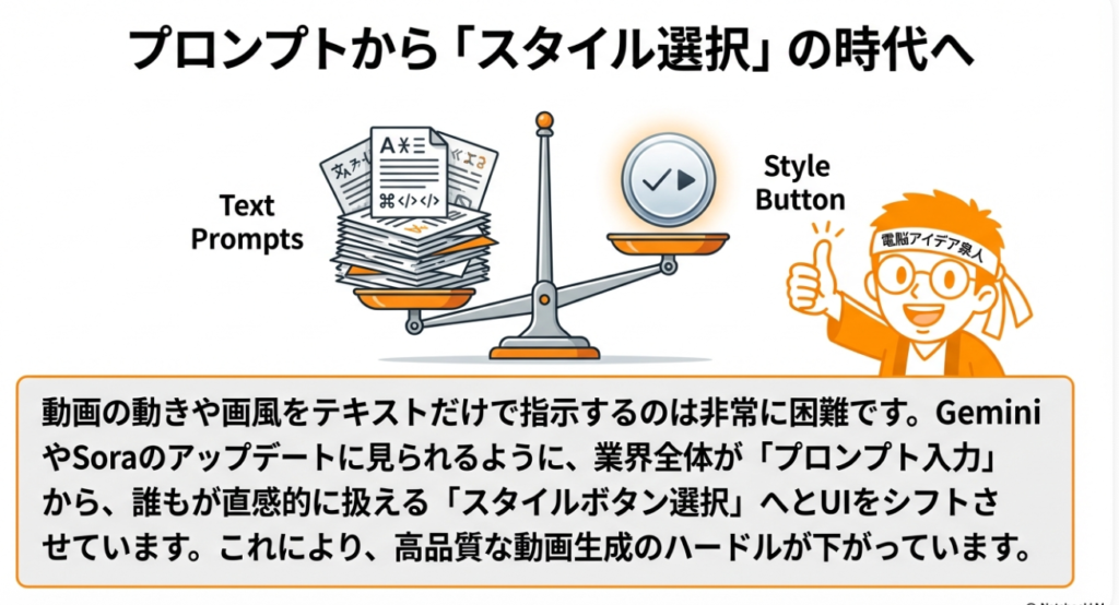 🎨 スタイル選択 動画生成時に「アニメ風」「ヴィンテージ」「コミック」など、映像の表現スタイルをあらかじめ選べる機能です。SoraとVeo 3の両方で新たに導入されました。動画はテキストだけでスタイルを指示するのが難しいため、プリセットから選ぶ方式の需要が高いとされています。