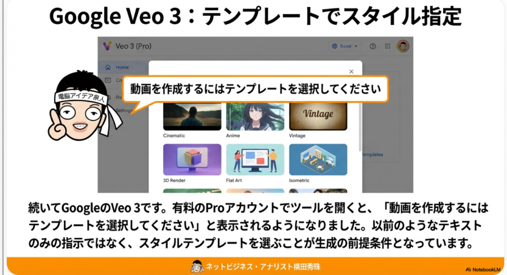 A3. 記事内でも触れた通り、Google Veo 3のテンプレート機能は、有料プラン(Pro)のアカウントでも使えるものと使えないものがあるようです。同じProアカウントでも、アカウントによって表示される機能が異なるケースが確認されています。これはGoogleが段階的に機能を展開(ロールアウト)しているためと考えられますので、お使いのアカウントでまだ表示されない場合は、しばらく待ってから再度確認してみてください。