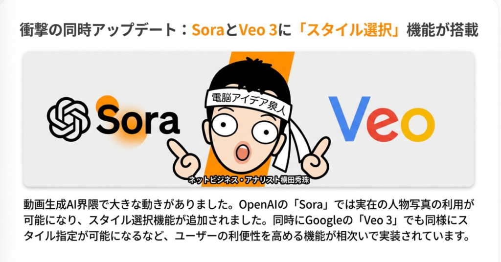 📊 Sora実在人物写真が可能に!Veo3もスタイル選択対応