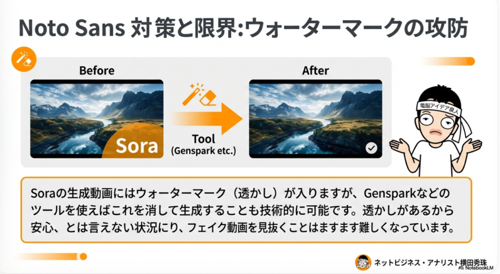 コンテンツの「出自(オリジン)」を証明する技術的透明性は、企業の誠実さを象徴する指標です。Soraで生成された動画にはAI生成物であることを示すウォーターマーク(電子透かし)が自動付与されますが、一方でGenspark等の外部ツールを用いてこれを削除する行為が容易に行われている現状があります。