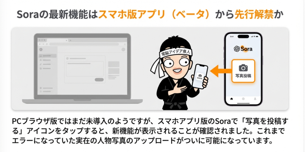 📱 スマホアプリ版Sora Soraの機能はPC版とスマホアプリ版で差異があります。人物写真のアップロード機能はスマホアプリで先行導入されました。一方、下書き動画のダウンロードや投稿はPC版ブラウザからの操作が必要など、UIに違いがあります。