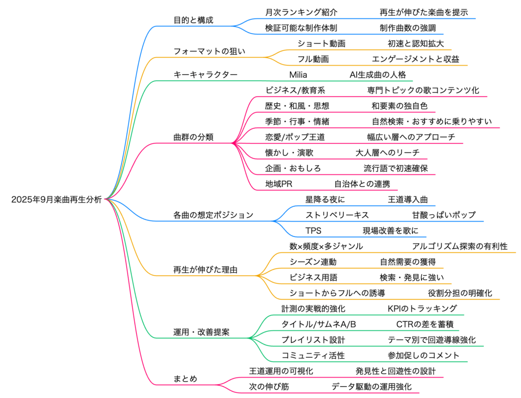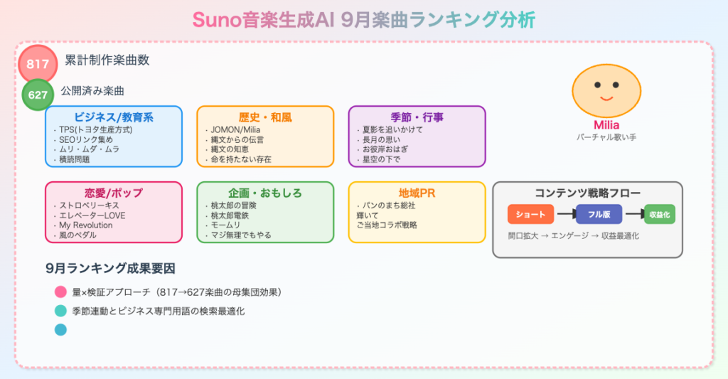 本日のテーマは「SunoP横田秀珠が音楽生成AIで公開した累計817曲の中で公開した627曲から2025年9月に生成した楽曲で再生回数の多かったもの」をご紹介するというものです。フル動画と1分のショート動画の中から、ランキング形式で紹介していきたいと思います。