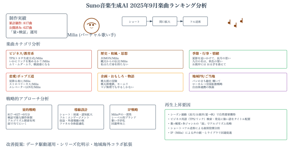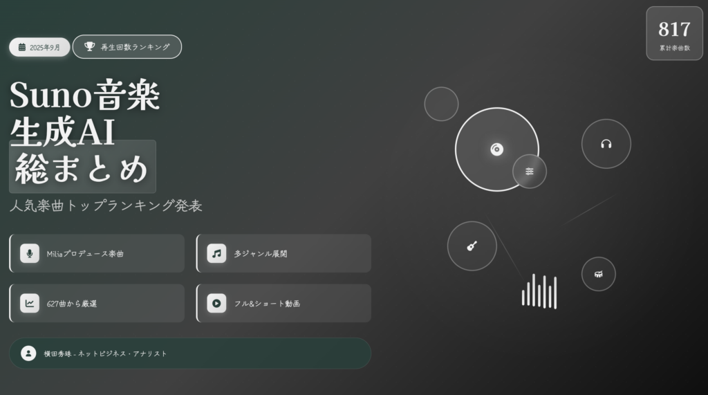 今回は、音楽生成AI「Suno」を活用して制作された2025年9月の人気楽曲をランキング形式でご紹介してまいりました。累計817曲、公開627曲という膨大な楽曲ライブラリの中から、再生回数の多かった楽曲を厳選してお届けしましたが、いかがでしたでしょうか。Miliaさんプロデュースの楽曲を中心に、ビジネスをテーマにしたもの、日本の伝統や歴史をテーマにしたもの、日常の何気ない瞬間を切り取ったもの、そして哲学的な問いを投げかけるものまで、実に多彩なジャンルとテーマの楽曲が生み出されていることがお分かりいただけたかと思います。音楽生成AIの技術は日々進化を続けており、人間のクリエイターと協働することで、これまでにない新しい音楽体験を創出しています。本記事で紹介した楽曲はほんの一部であり、まだまだ多くの素晴らしい楽曲が存在しています。これからも音楽生成AIの可能性を追求し、多くの人々に楽しんでいただける楽曲を発信し続けてまいります。ネットビジネス・アナリスト横田秀珠がお届けする音楽生成AIの世界を、今後もぜひお楽しみください。ご視聴いただき、誠にありがとうございました。