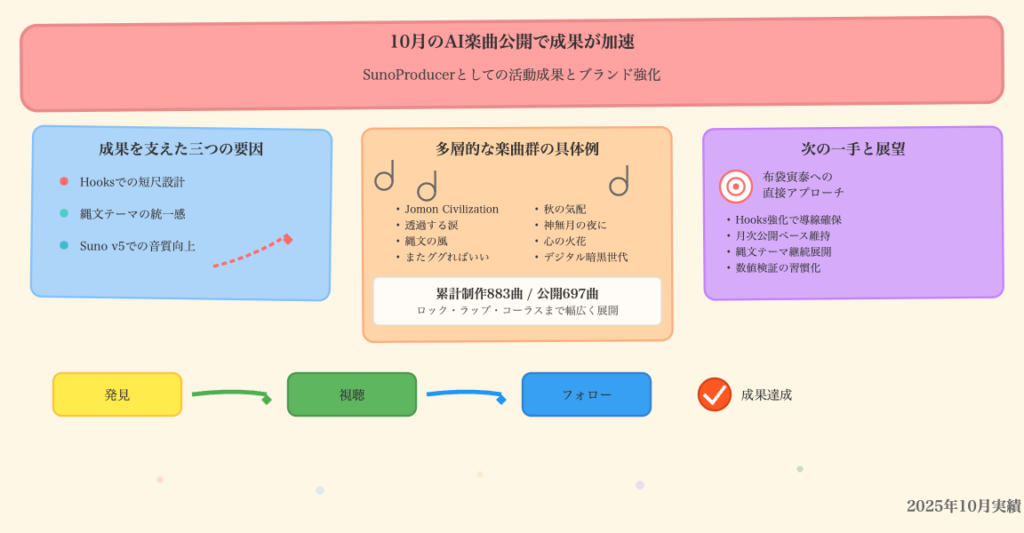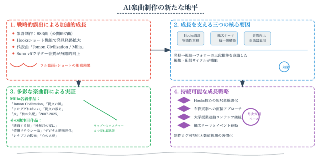 音楽生成AI「Suno」を使った横田秀珠さんの2025年10月の創作活動をご紹介してきました。累計883曲、公開697曲という圧倒的な制作量は、AI技術が音楽制作の民主化をもたらしていることを証明しています。特にSunoのHooks機能によるショート動画配信が功を奏し、フォロワーの急増という具体的な成果も上がっています。Miliaプロジェクトを中心とした縄文文化をテーマにした楽曲群から、情報リテラシーやデジタル社会をテーマにした教育的な楽曲、そして季節感や日常を描いた楽曲まで、そのジャンルは実に多彩です。プロのギタリスト布袋寅泰さんに演奏してほしいと思えるほどのクオリティの楽曲が生まれているのは、Suno5へのバージョンアップによる音質向上も大きく寄与しています。音楽生成AIは、もはや単なるツールではなく、新しい表現の可能性を切り開くパートナーとなっているのです。今後の創作活動にも大いに期待が高まります。