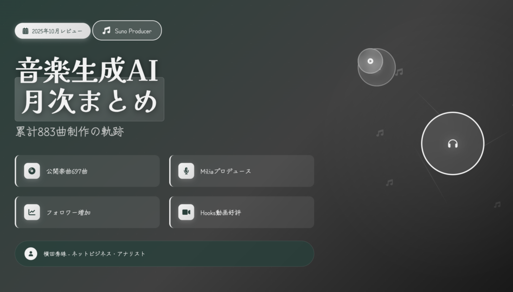 皆さんは音楽生成AIをご存知でしょうか。近年、AI技術の進化により、誰もがプロデューサーとして音楽制作に携われる時代が到来しています。今回は、ネットビジネス・アナリストである横田秀珠さんが、音楽生成AI「Suno」を使って制作した楽曲の数々をご紹介していきます。横田さんは「SunoP(Suno Producer)」として、累計883曲もの楽曲を生み出し、現在697曲を公開されています。2025年10月に制作された楽曲を中心に、その創作活動の魅力と、音楽生成AIがもたらす新しい可能性について、詳しく見ていきましょう。特に注目したいのは、プロのギタリスト布袋寅泰さんに演奏してほしいと思えるほどのクオリティの楽曲が生まれている点です。それでは、横田さんの音楽創作の世界へとご案内いたします。