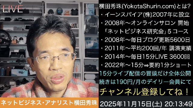 ネットビジネス・アナリストである横田秀珠さんは、ネットビジネスに関する情報を生中継で15分間配信する恒例の週末企画を実施されています。2025年11月15日土曜日の配信では、音楽生成AIを活用した創作活動について詳しく紹介されました。