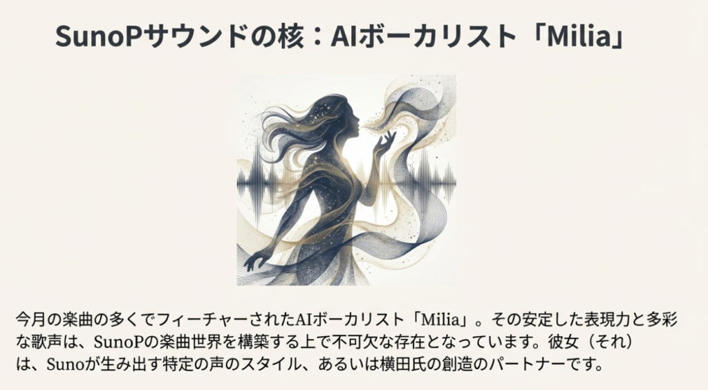 A4. Miliaは、Sunoの音楽生成AIが生成するボーカルの一つです。横田さんの楽曲の多くでMiliaがボーカルを担当しており、様々なジャンルの楽曲を歌いこなしています。AIが生成するボーカルでありながら、感情豊かな歌声が特徴で、多くのリスナーから支持されています。