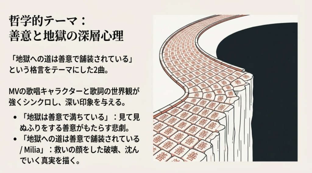 この楽曲群が持つ洞察の深さを最も象徴しているのが、「地獄は善意で満ちている」と「地獄への道は善意で舗装されている」で提示される逆説的なテーマである。