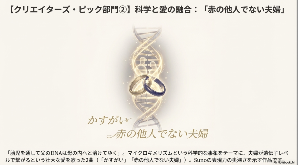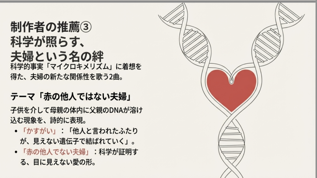 本楽曲群における歌詞表現の白眉とも言えるのが、夫婦の絆を科学的な視座から再定義する試みである。「赤の他人でない夫婦」や「かすがい」では、かつては「他人」であった二人が、子供という存在を介して遺伝子レベルで結びつくという独創的なテーマが探求されている。