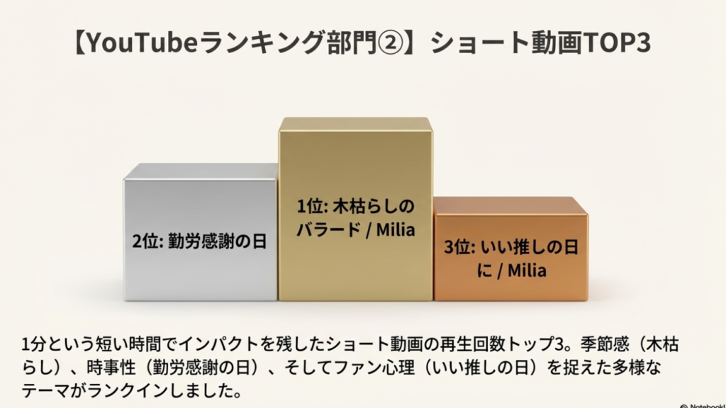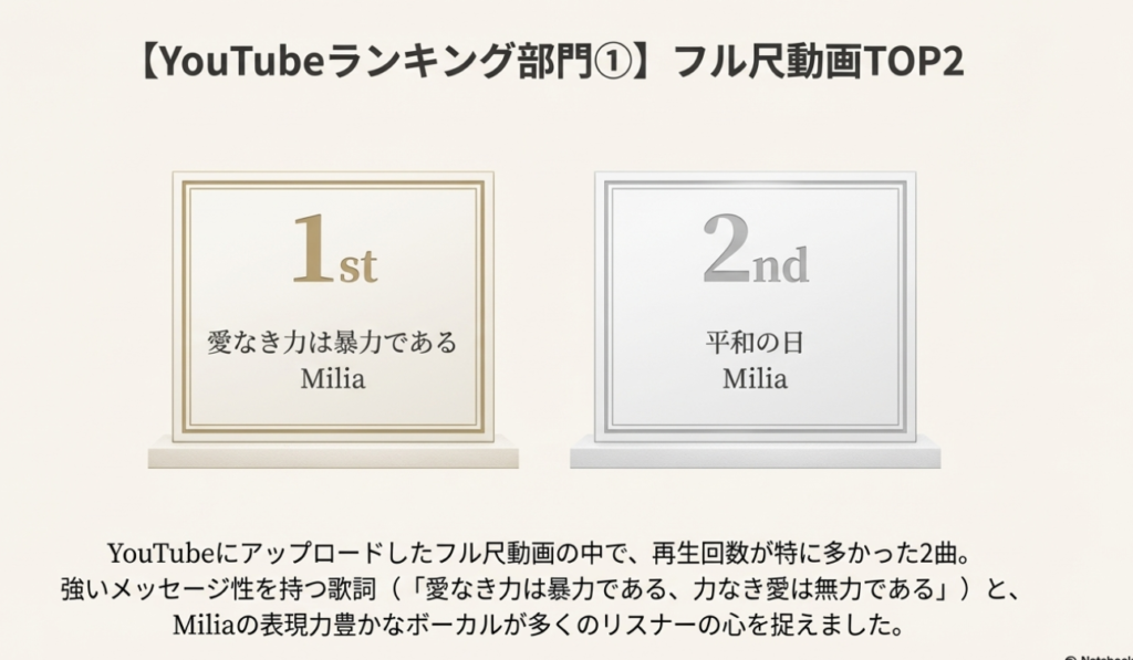 楽曲面では、「最強彼氏 / Milia」がSunoで再生回数1000回を超える爆発的ヒットとなり、YouTubeでは「愛なき力は暴力である / Milia」が最も多くの再生回数を記録しました。ショート動画では「木枯らしのバラード / Milia」が1位を獲得しています。