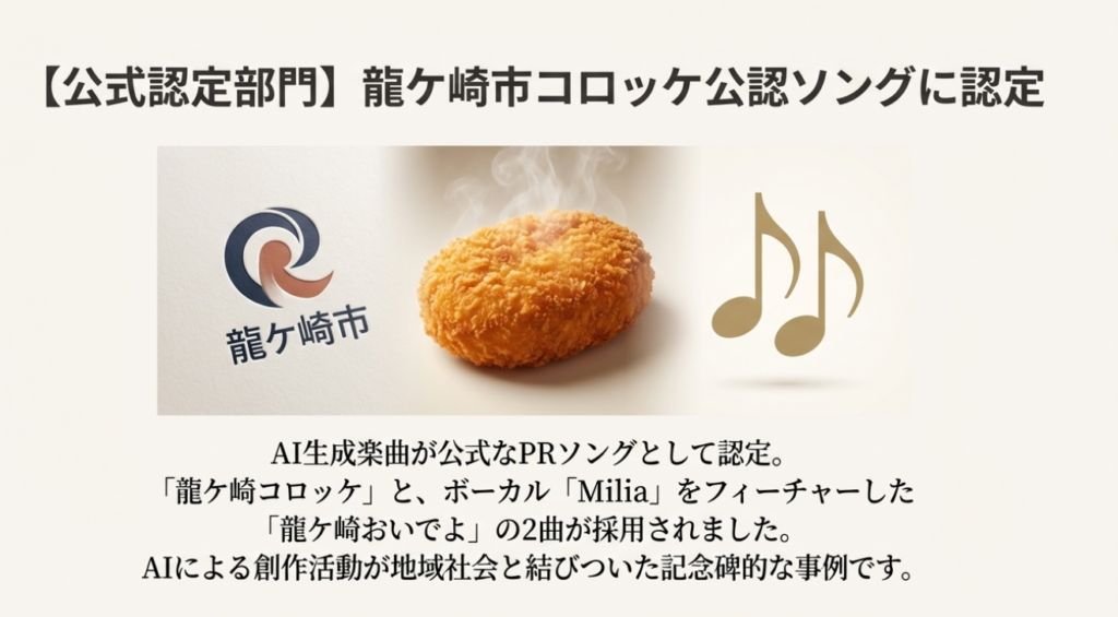 🍘 龍ヶ崎コロッケ公認ソング 龍ヶ崎コロッケとは茨城県龍ケ崎市の名物B級グルメで、横田氏が制作した2曲が公式の公認ソングとして認定されました。AIで生成した楽曲が地域の公認を受けた事例として注目に値します。地方創生やご当地PRにおいて、音楽生成AIを活用した新しいプロモーション手法の可能性を示しています。