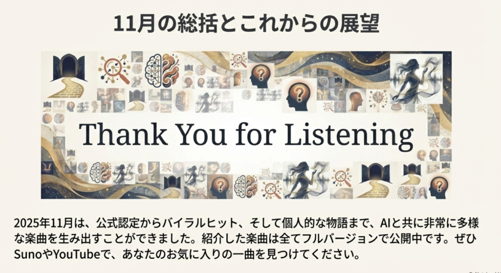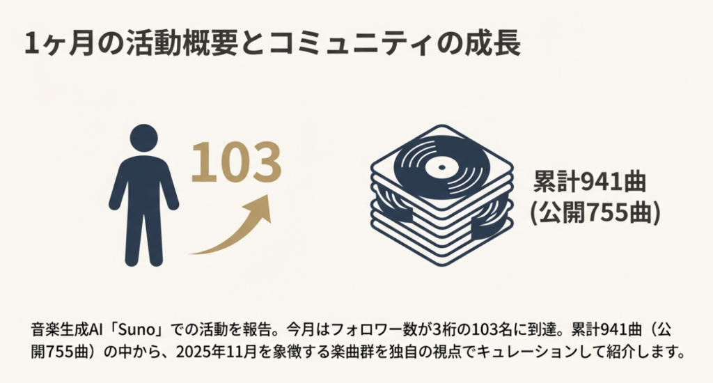 2025年11月も、音楽生成AI「Suno」を活用して多くの楽曲を制作・公開することができました。累計941曲、公開755曲という数字は、AIと人間の創造性が融合することで生まれる可能性の大きさを示しています。