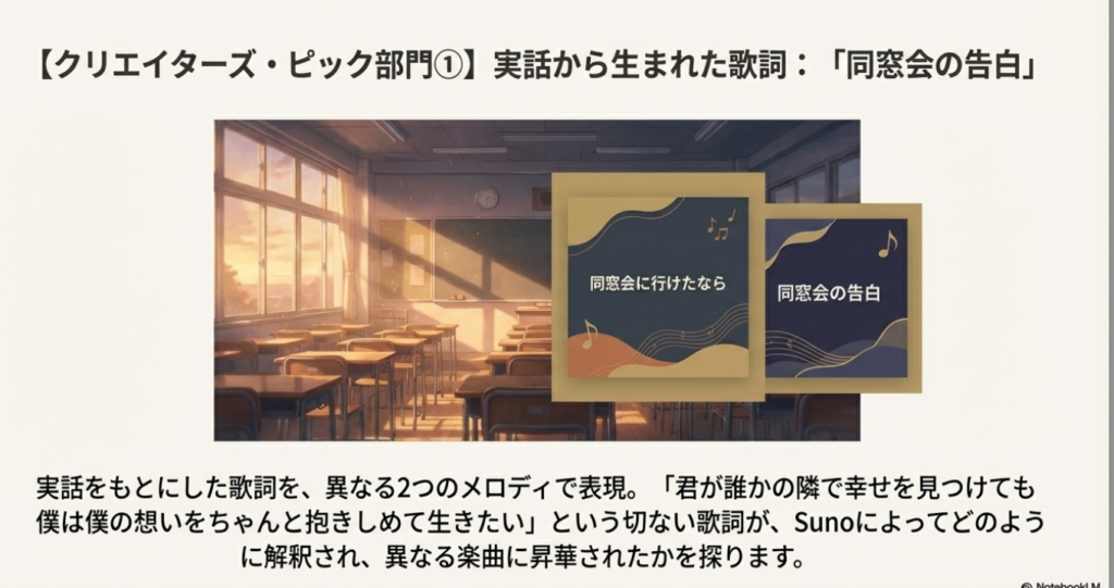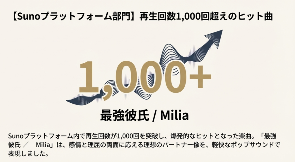 📊 再生回数 再生回数とは、Sunoプラットフォームやショート動画での楽曲視聴数を指します。横田氏の「最強彼氏」はSuno上で1000回を超える再生を記録し「爆発的なヒット」と紹介されました。音楽生成AIの世界でも従来の音楽配信と同様に、再生回数が作品の人気指標として機能していることがわかります。