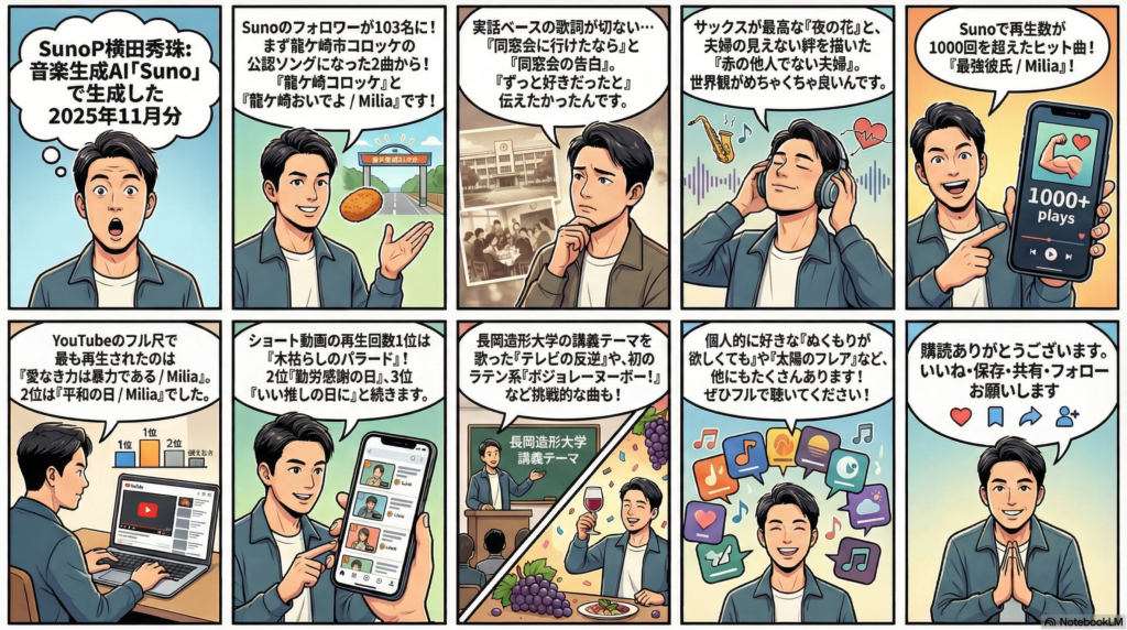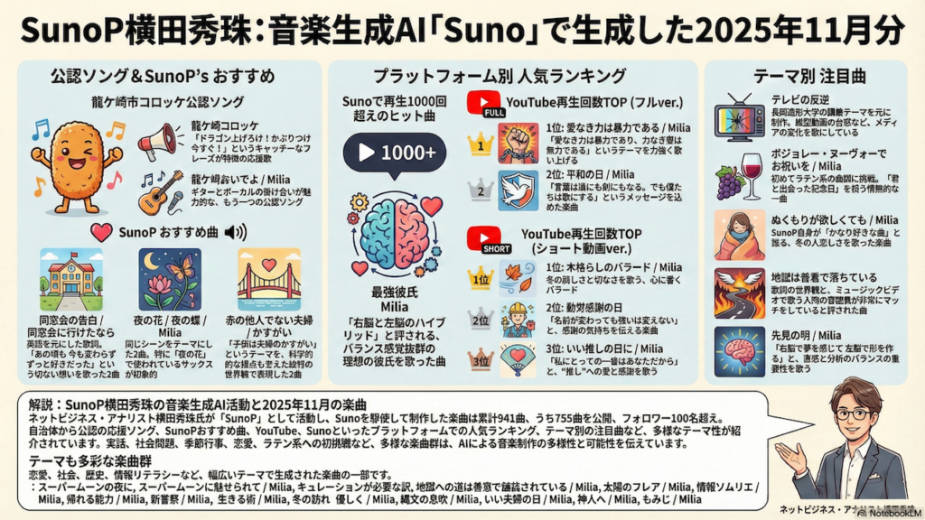 ネットビジネスアナリストの横田秀珠氏が、音楽生成AI「Suno」で制作した楽曲の2025年11月分を紹介。累計941曲を制作し、フォロワーは103名に到達。龍ヶ崎市コロッケの公認ソング2曲をはじめ、AIボーカリスト「Milia」が歌う多彩なジャンルの楽曲を披露。同窓会をテーマにした実話ベースの曲や、長岡造形大学の講義テーマを歌にした「テレビの反逆」、Suno上で再生回数1000回超えの「最強彼氏」など、多数の作品を紹介した。