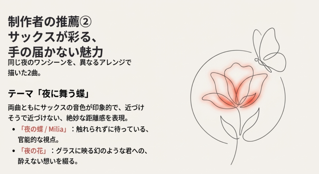 「夜の花」と「夜の蝶」では、「蝶」というメタファーを用いて、美しくも決して手に入れることのできない、儚い関係性が象徴的に描かれている。