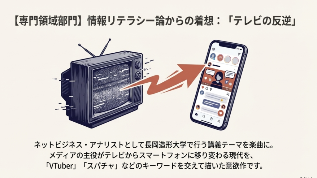 🏫 長岡造形大学 長岡造形大学は新潟県長岡市にある公立大学で、横田氏が講師として授業を担当しています。「テレビの反逆」は同大学での講義テーマを楽曲化したもの。教育現場の内容を音楽生成AIでコンテンツ化するという、学術とエンターテインメントを融合させた新しい情報発信の形を実践しています。