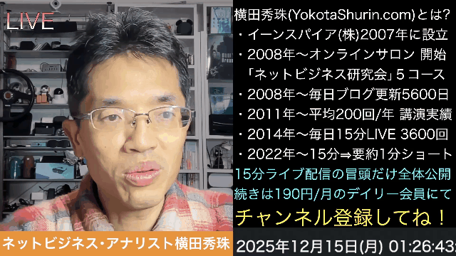 皆さんこんにちは。ネットビジネスアナリスト横田秀珠です。今日もネットビジネスに関する情報を生中継で15分間お届けしてまいります。今日もよろしくお願いします。