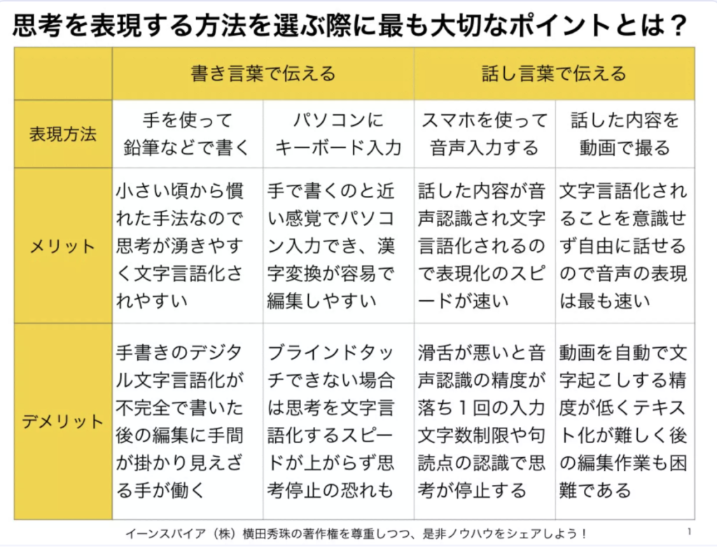 思考表現「手で書く」「PC打つ」「スマホ音声入力」「動画で話す」