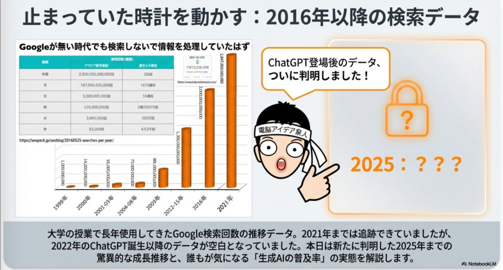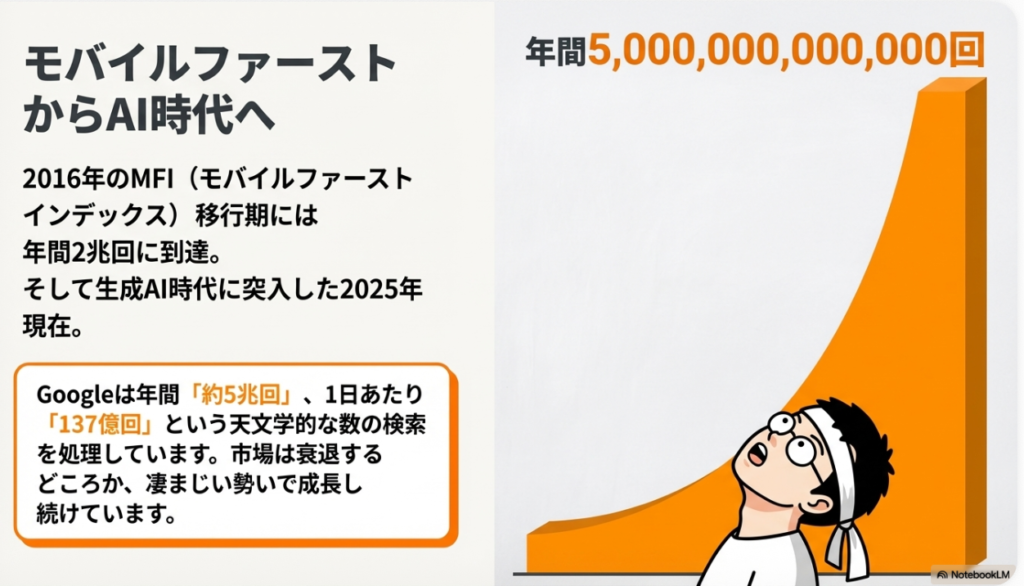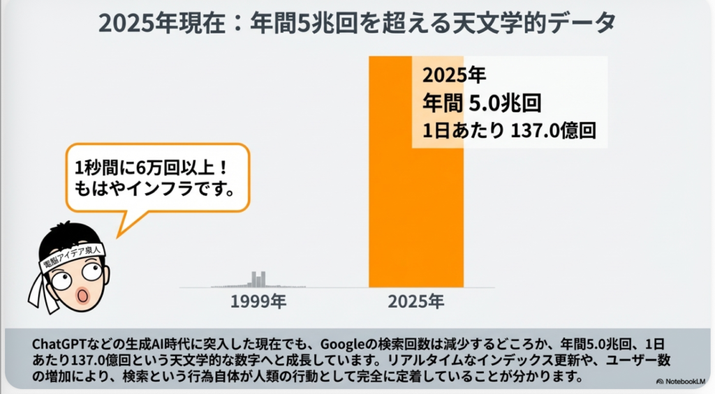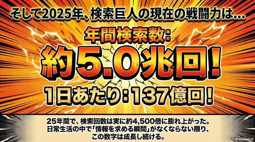 そして、このモバイルファーストインデックス移行期が終わりますと、2025年の数字が出てきます。まさに生成AI時代ですが、年間の検索数が約5.0兆回、そして月間約4,167億回、そして1日あたりだったら137.0億回という数字になったわけです。こうなっていくと、この25年ぐらいの間に、検索数がどのくらい増えたかと言うと、ちょっとすごい数字のものになっているわけなのですが。