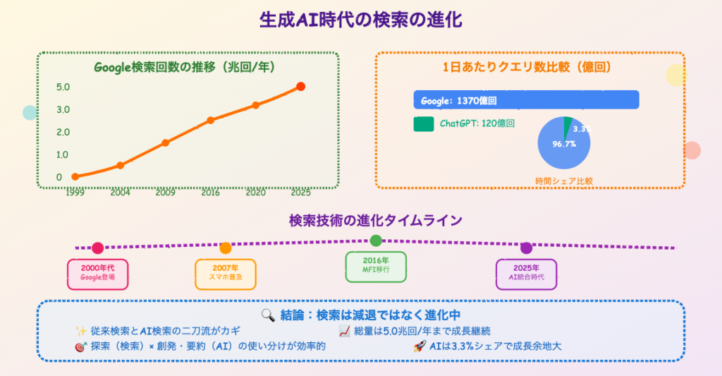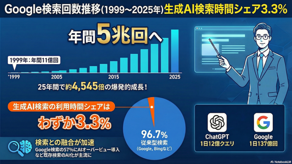 Google検索の回数は1999年の年間約11億回から2025年には約5兆回へと急成長を遂げた。2000年代のIT革命、2010年前後のスマホ普及、2016年のモバイルファーストインデックス移行などが成長を後押しした。一方、2022年のChatGPT登場後もAI検索の利用時間シェアはわずか3.3%にとどまり、従来型検索エンジンが96.7%を占めている。AI検索は「探す」行為よりも「答えやアイデアを得る」用途で使われる傾向があり、Google検索を置き換えるには至っていない。