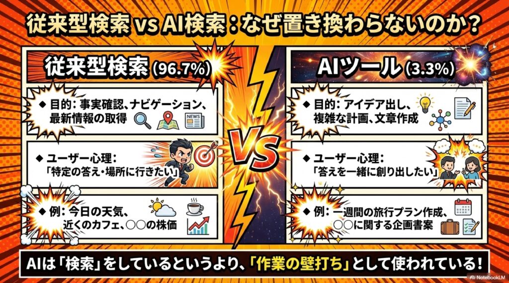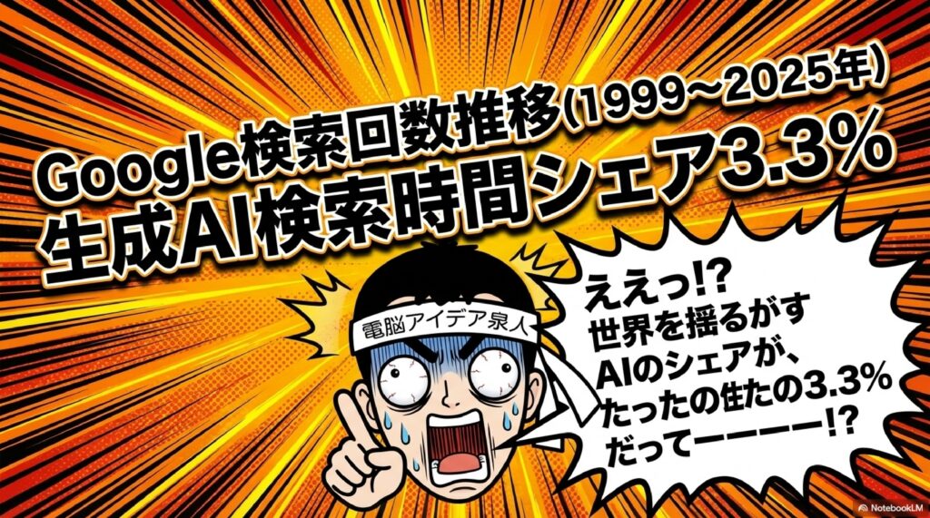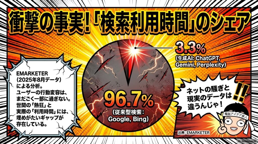 - AI検索シェアはまだ3.3% — 時間ベースでは従来型検索が圧倒的