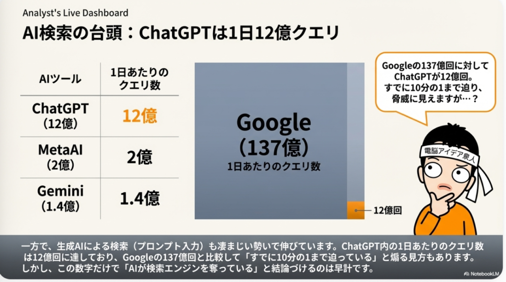 さあ、ここで今日後半に紹介したいのがAI検索です。これはChatGPTが明かした数字なのですが、こういう数字が出ています。まずChatGPT内のいわゆるAI検索をしている人の1日あたりのクエリ数で12億回あるということなんですね。つまり、これは検索数ではなくて、チャットのやり取りになるので、文章で何かクエリを打って探す行為をしたというものをクエリと言っていますが、その数が12億回になったということなんですね。