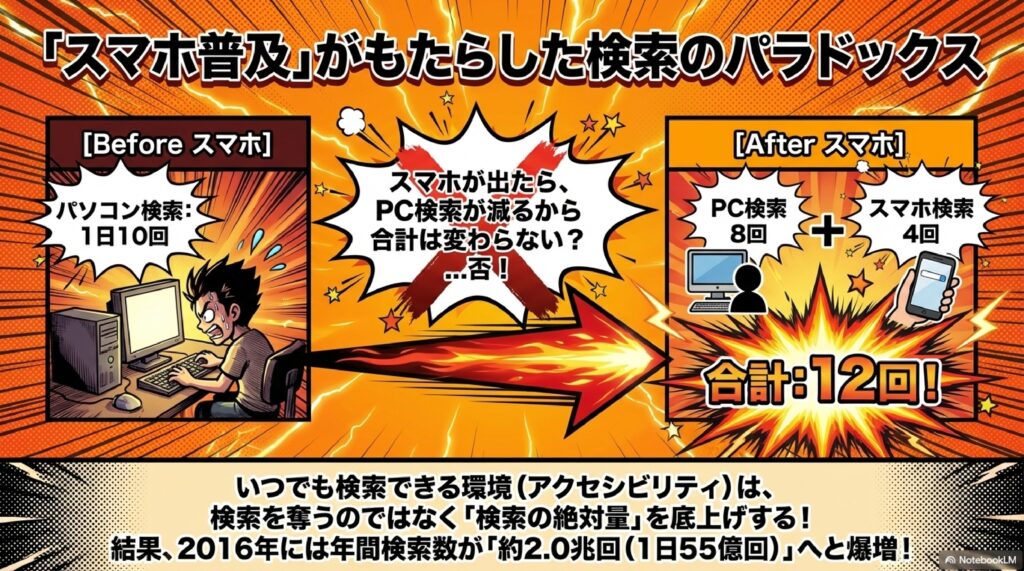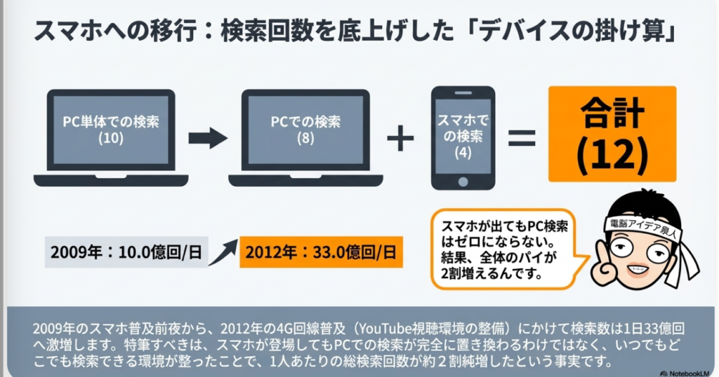 興味深いのは、スマートフォンの登場がPC検索を単に代替したのではなく、検索行動そのものを拡張したという点です。PCで1日10回検索していた人がスマホを持つと、PC検索が8回に減る一方でスマホ検索が4回加わり、合計12回と2割ほど検索回数が増加するという現象が起きました。さらに3G回線から4G回線への移行が進むと、動画コンテンツもスマホで快適に視聴できるようになり、一気にスマホへの買い替えが加速します。こうした「スマホ移行期」の2012年には、年間検索回数がついに約1.2兆回を突破し、1日あたり33億回という驚異的な数字に到達しました。YouTubeの普及もこのタイミングと重なっており、動画を探す行為も含めて検索需要が爆発的に増大した時期だったのです。
