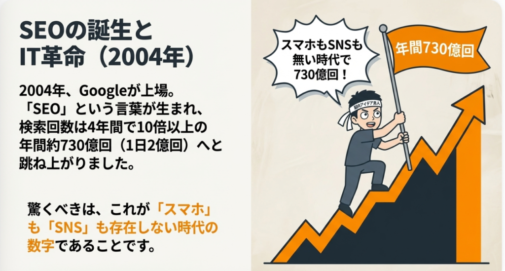 そして2004年。2004年というのはGoogleが上場した年と書かれていますが、もうここですごいですよね。この4年間で66億回から約730億回だから、10倍以上増えているんですよね。2004年というのは、私がちょうどこのITという業界に入った年なんですね。SEOという言葉が生まれた2004年ぐらいなんですよ。Yahoo!カテゴリ登録するだけで上位表示する、タイトルタグにキーワード入れるだけでOKみたいな時代でした。