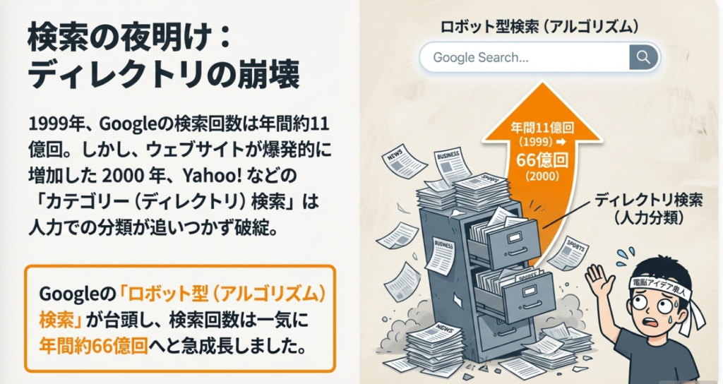 Googleは1998年9月4日に創業し、翌1999年時点の年間検索回数は約11億回、1日あたりわずか300万回という規模でした。当時はYahoo!に代表されるディレクトリ型検索(カテゴリー検索)が主流であり、Webサイトを人力で分類・登録する仕組みが一般的でした。しかし2000年前後になると企業が次々と公式サイトを開設し、カテゴリーで情報を整理する仕組み自体が破綻し始めます。いわゆる「IT革命」が叫ばれた2000年、Googleの年間検索回数は約66億回に急増し、1日あたり1,800万回へと跳ね上がりました。