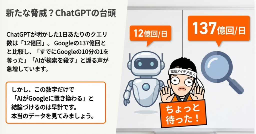 🤖 ChatGPT OpenAIが2022年に公開した対話型生成AIサービスのこと。AI検索としての1日あたりのクエリ数は約12億回に達し、Google検索の約10分の1の規模にまで成長した。ただし利用時間シェアでは3.3%にとどまり、従来型検索を代替するまでには至っていない。