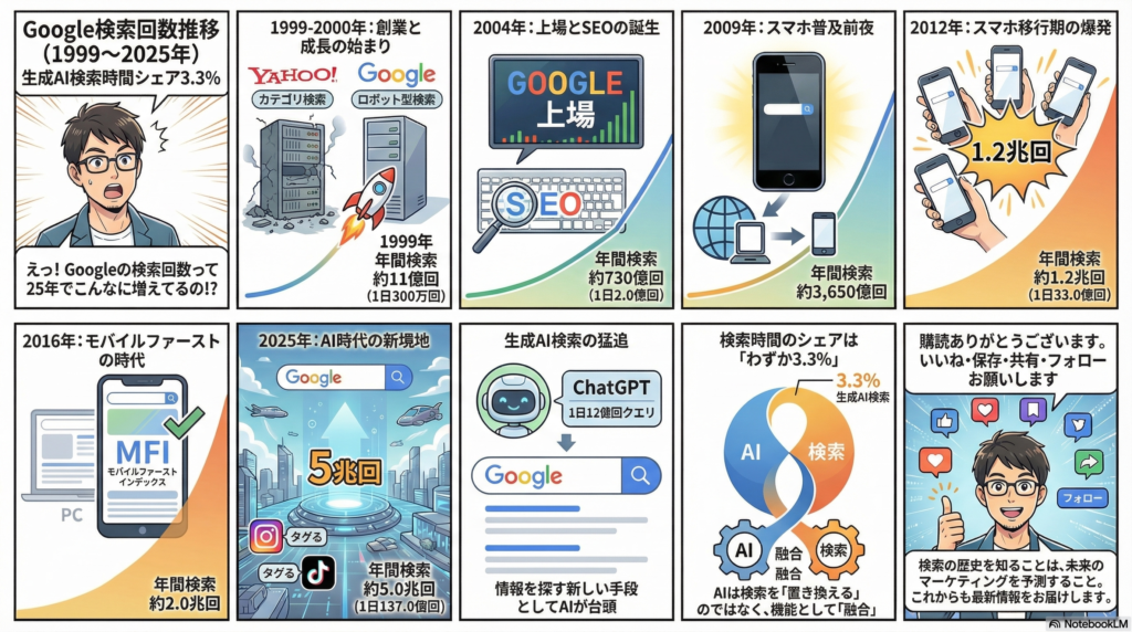 今回は、1999年から2025年までのGoogle検索回数の推移を通じて、検索の歴史を振り返ってきました。年間11億回だった1999年から、わずか25年で年間5兆回にまで成長したGoogle検索。その背景には、Yahoo!ディレクトリ型検索の限界、IT革命、スマートフォンの普及、4G回線の登場、SNS検索文化の広がり、そしてモバイルファーストインデックスへの移行など、さまざまな時代の変化がありました。そして2022年以降、ChatGPTをはじめとする生成AIが登場し「Google検索は終わるのでは?」と言われましたが、データで見る限り、検索利用時間のシェアで生成AIはわずか3.3%。Google検索は依然として圧倒的な存在感を示しています。AI検索は「ググる」を置き換えるものではなく、むしろ補完的に使われているというのが現時点での実態と言えるでしょう。