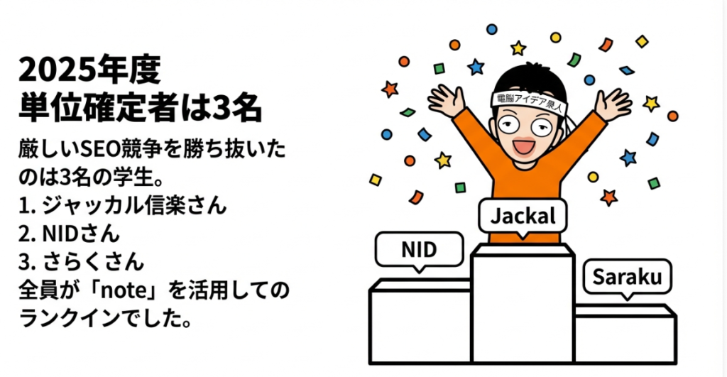 🏆 単位確定 Google検索の上位20位以内に自分のレポートがランクインした学生に与えられる特典で、テストの点数に関係なく単位が認定される制度。Googleという第三者の客観的評価を基準にしている点がユニークで、学生のSEOやWebライティングへの動機づけにもなっている。