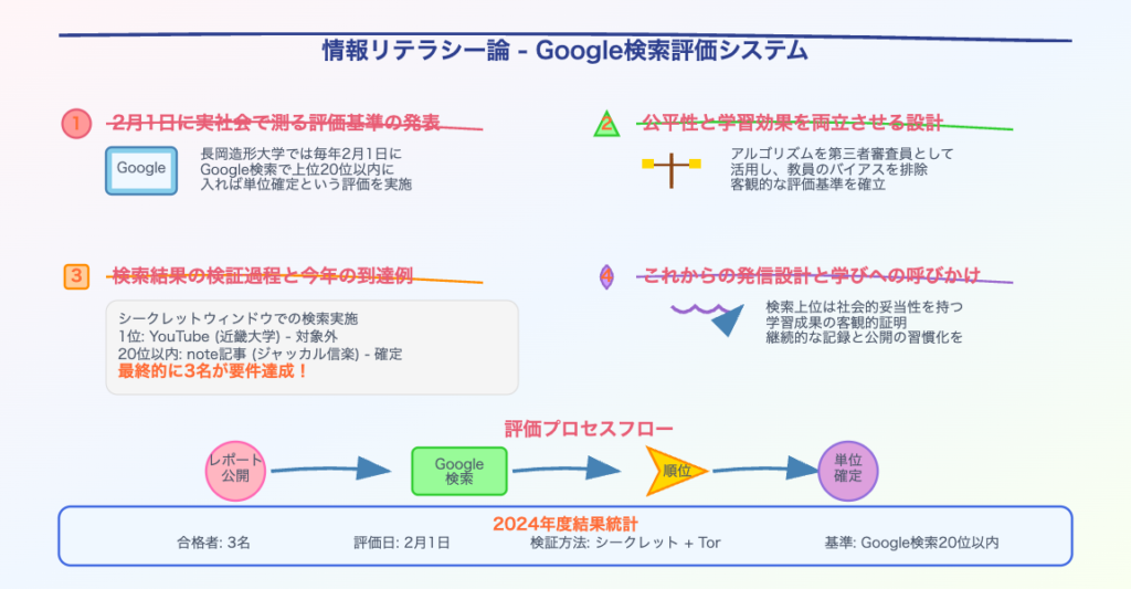長岡造形大学の「情報リテラシー論」で実施されているGoogle検索順位評価制度は、デジタル時代の情報リテラシー教育における革新的かつ意欲的な試みである。学生に実践的なWeb発信スキルを習得させ、社会的な指標による客観的評価を体験させるという点で、顕著な教育的価値を有する。