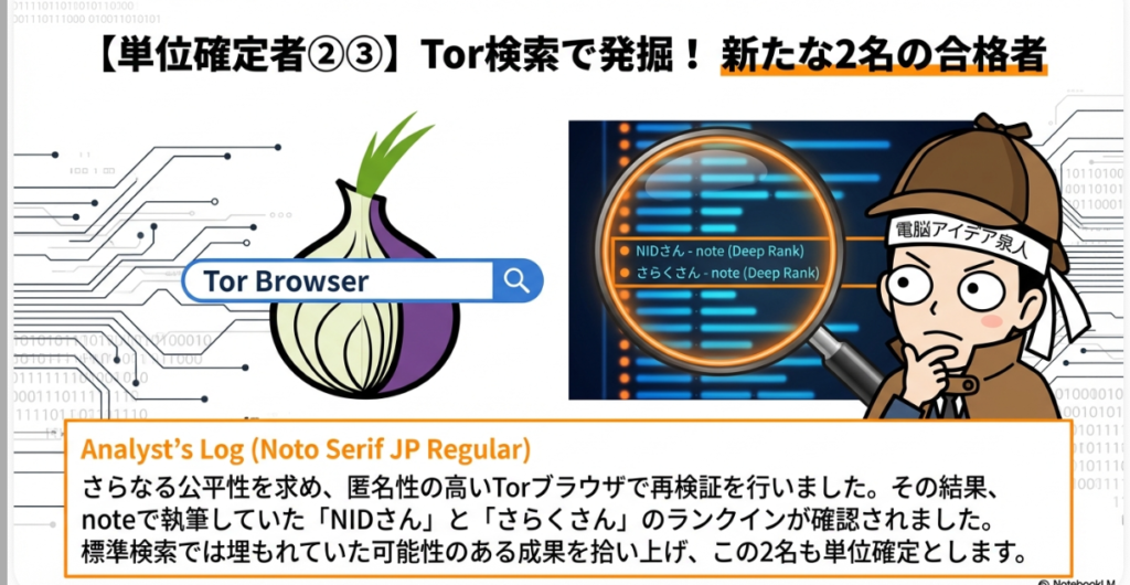 🌐 Torブラウザ 通信を複数のサーバーを経由させることで匿名性を高めるブラウザ。シークレットウィンドウでも位置情報が取得されてしまうため、より正確で中立な検索結果を得る手段として併用されている。実際にTorブラウザで追加の単位確定者が見つかったケースもある。