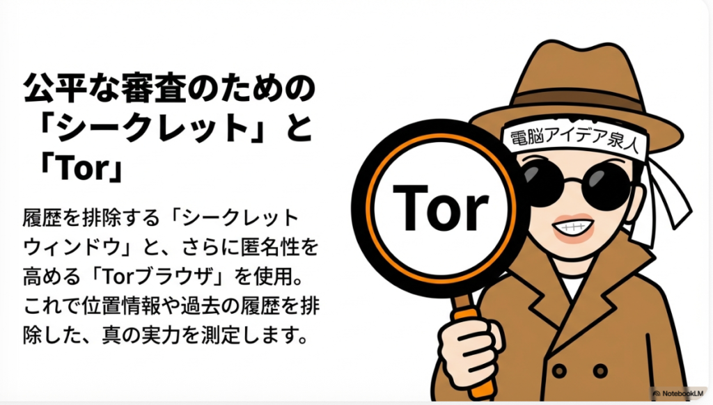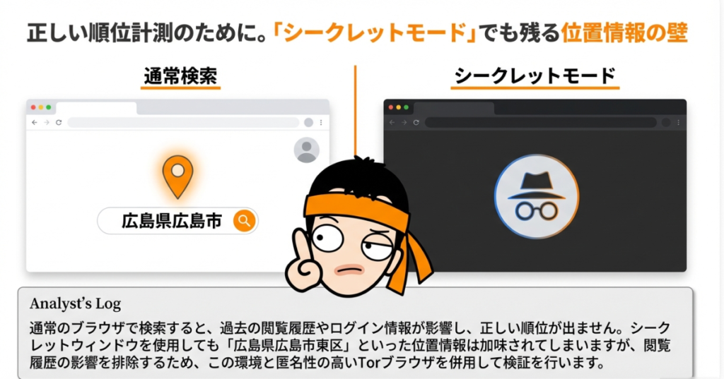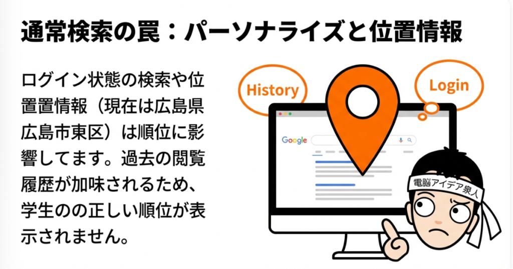 2. シークレットウィンドウの使用: 閲覧履歴の影響を排除するため、ブラウザの「シークレットウィンドウ」機能が使用された。ただし、この方法でも位置情報(判定時は講師の現在地である広島市)はGoogleに把握されるため、完全な客観性の担保には限定的な効果となる点が考慮された。
