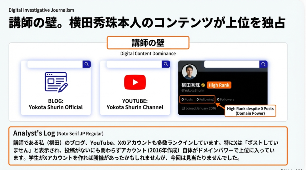 • 講師コンテンツとの競合: 講師自身のコンテンツが検索上位に存在することは、学生が「評価者」と直接競合するという構造的な利益相反を生んでおり、評価の公平性に対する疑念を招く可能性がある。