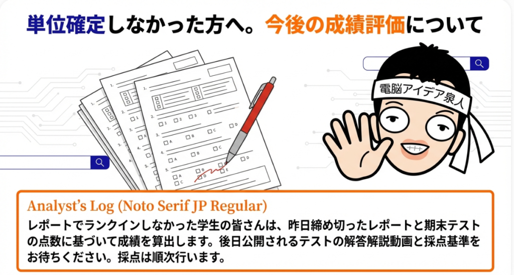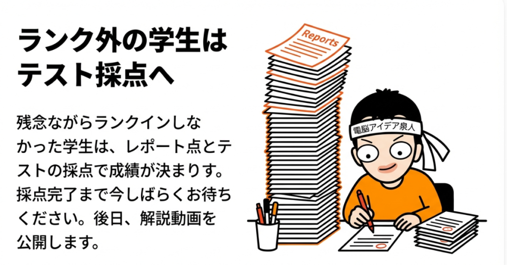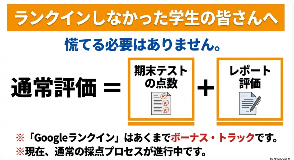 A4. いいえ、そんなことはありません。Google検索ランキングでの単位確定はあくまで「特別枠」です。上位20位以内に入った場合は、テストの点数に関係なく単位が確定するという特典ですが、ランクインしなかった学生は通常通りテストの採点によって単位が判定されます。レポートの提出締め切りは1月31日で、その後テストの採点が行われ、解答解説と採点基準についても後日動画で公開される予定です。