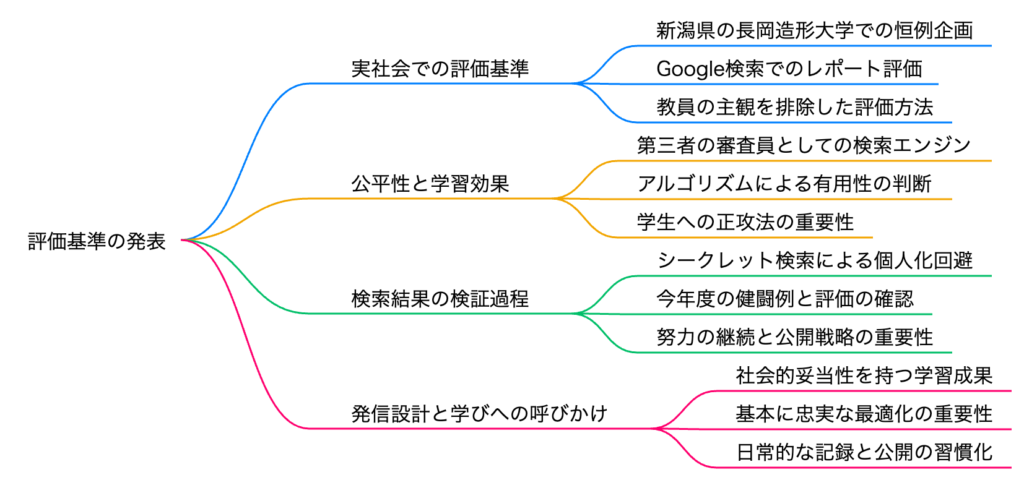 Google検索順位という単一の指標に依存するリスクを軽減し、学生の多様な努力を評価するため、基準の多角化を提言する。