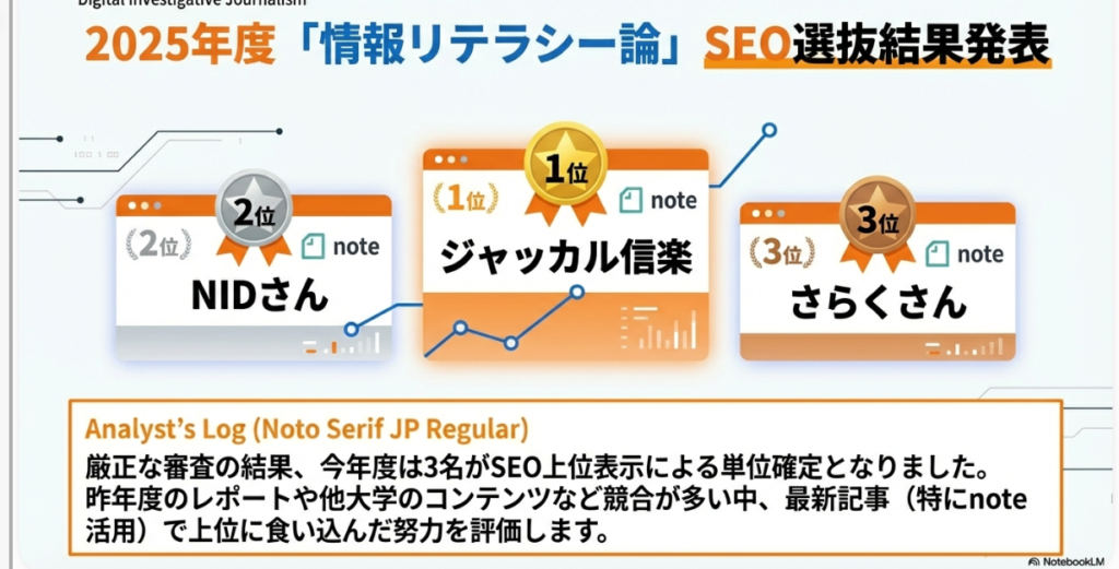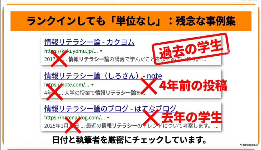 • 根拠: 講師である横田秀珠氏の「Googleが『情報リテラシー論と言えばこのサイトが詳しい』と認めたのであれば、それは単位として認定すべきである」という思想に基づいている。これは、学内での評価にとどまらず、社会における情報価値を基準とすることの正当性を示している。
