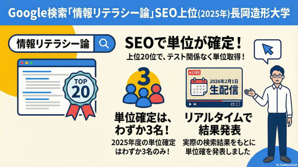 毎年2月1日になると、新潟県の長岡造形大学では、ちょっと変わった「恒例行事」が行われます。それは、大学の講義「情報リテラシー論」にまつわる、Google検索ランキングを使った単位確定の発表です。「え、Google検索で単位が決まるの?」と驚かれる方も多いかもしれません。実はこれ、担当の横田先生がここ10年ほど続けているユニークな企画なのです。学生たちが半年間かけて書いたブログ形式のレポートが、Google検索結果の上位にランクインすれば、テストの点数に関係なく単位が確定するという、なんとも画期的な仕組みになっています。SEO(検索エンジン最適化)の実践力が問われるこの企画は、まさに「情報リテラシー」の真価が試される場です。今回の記事では、2026年2月1日に行われたリアルタイム発表の模様を、検索結果の1位から順に詳しくお届けしていきます。