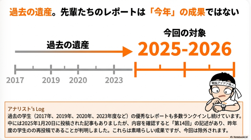 2. コンテンツの永続性とアルゴリズムの特性: 過去の学生のレポートが長年にわたり上位表示され続けている事実は、Webコンテンツの永続性を示すと同時に、現役学生がいかに厳しい競争環境に置かれているかを物語る。特に、投稿が一切ないXアカウントがランクインしている現象は、学生がコンテンツの質だけでなく、プラットフォームの持つドメインオーソリティという純粋なアルゴリズム的権威とも競合しなければならない、という課題の技術的・戦略的複雑さを象徴している。
