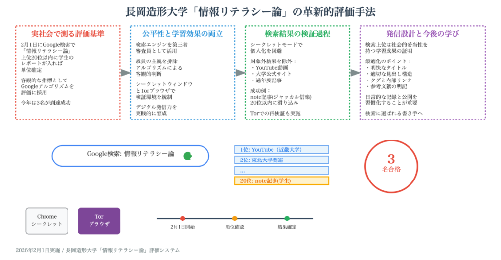 長岡造形大学の横田先生が担当する「情報リテラシー論」では、毎年2月1日にGoogle検索で「情報リテラシー論」と検索し、上位20位以内に学生のブログレポートがランクインしていれば、テストの点数に関わらず単位が確定するという恒例企画を実施している。正確な検索順位を得るため、シークレットウィンドウやTorブラウザを使用してパーソナライズや位置情報の影響を排除。2026年2月1日の結果では、noteなどでレポートを書いた3名の学生が上位20位以内にランクインし、単位確定となった。