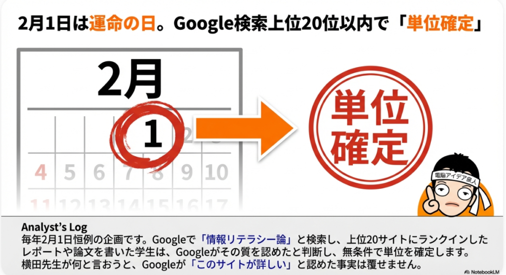 2026年2月1日、日曜日の朝8時39分。今年もこの日がやってきました。ここ10年ほど続いている恒例企画、それが「情報リテラシー論のGoogle検索結果の上位で単位確定者が決定する」というものです。