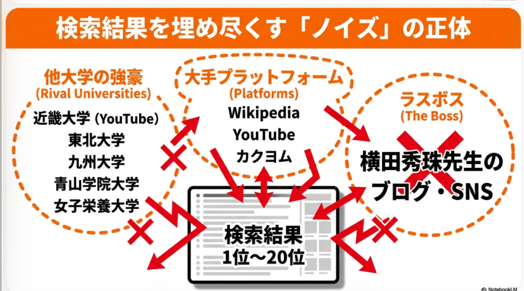 • その他: YouTubeのハッシュタグ検索結果、学術記事サイト(J-STAGE等)、大学の口コミサイト(みんなのキャンパス)、さらには投稿が一切ないにもかかわらずランクインしている過去のXアカウントなど。