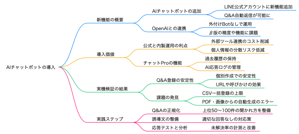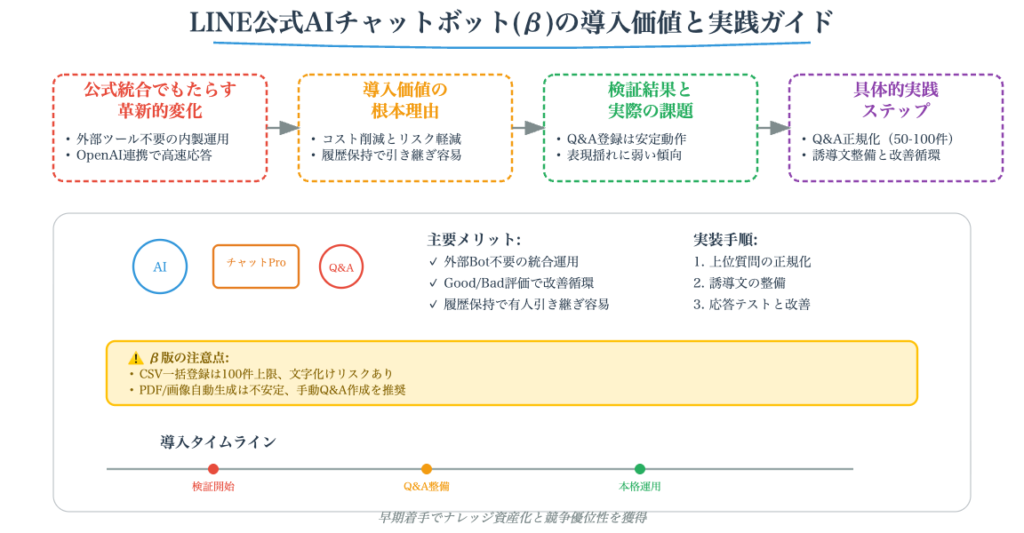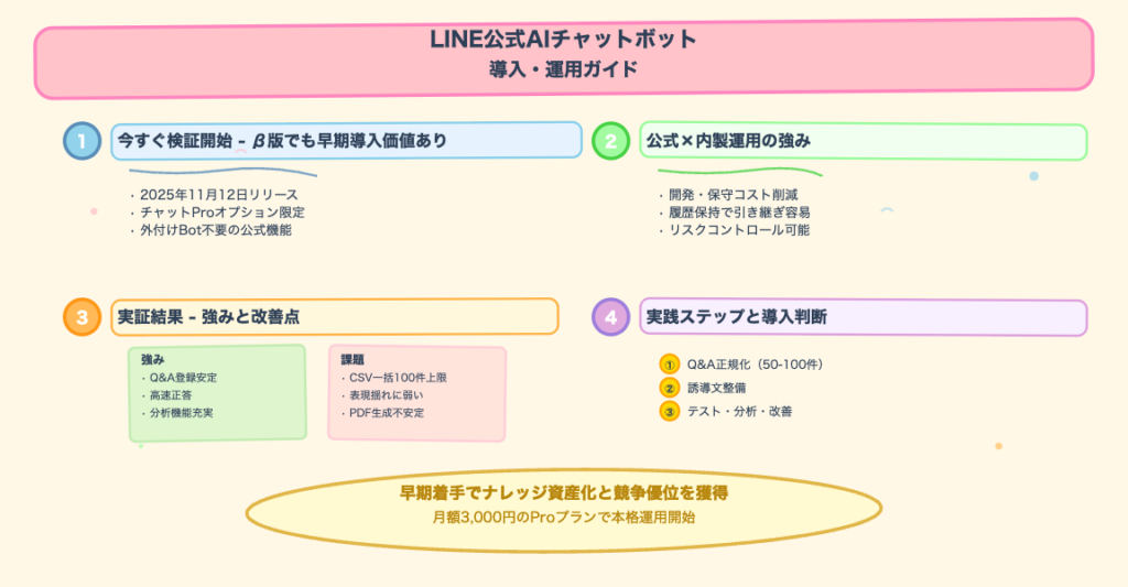 今回は、LINE公式アカウントのチャットProオプション限定で提供が開始されたAIチャットボット機能について、詳しく解説してきました。実際に設定して、様々なテストを行った結果、現時点での可能性と課題の両方が見えてきました。