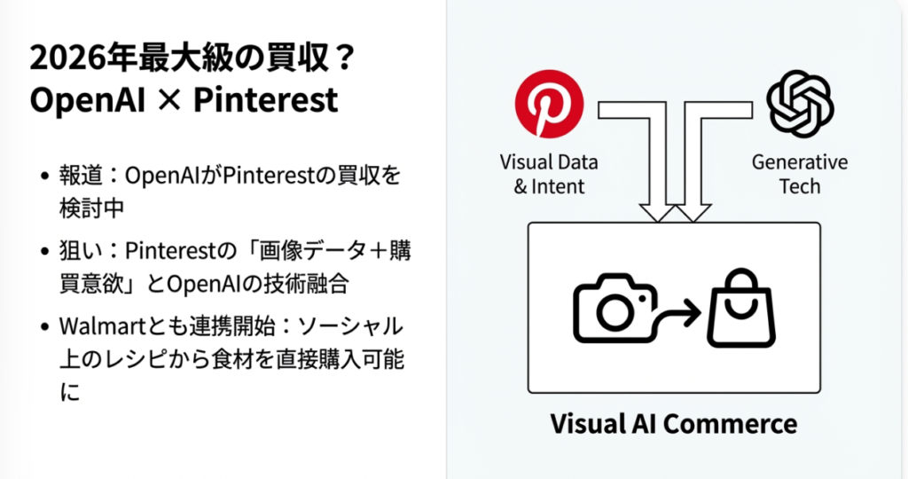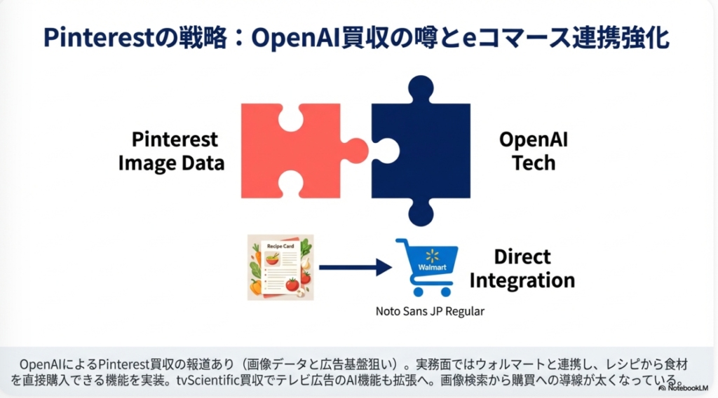 続いてPinterestに関するニュースなんですが、Pinterestの全世界で月間6億人、国内1280万人が利用するプラットフォームっていう数字が入っています。あとはウォルマート、「Pinterest」と連携開始。ソーシャル上のレシピから食材を直接購入できるってニュースが入ってて、あとOpenAIがPinterestを買収し、eコマースと広告のプレゼンスを強化すると報じるっていう噂が流れてるんだけど、これあったら結構衝撃のニュースかなって気がしているんですけど、などが入ってますね。そしてPinterestがテレビ広告のAI機能を拡張するためtvScientificを買収へ してるってことも入っていますね。さあ、この辺どうなりますかね。などが入っています。ということです。