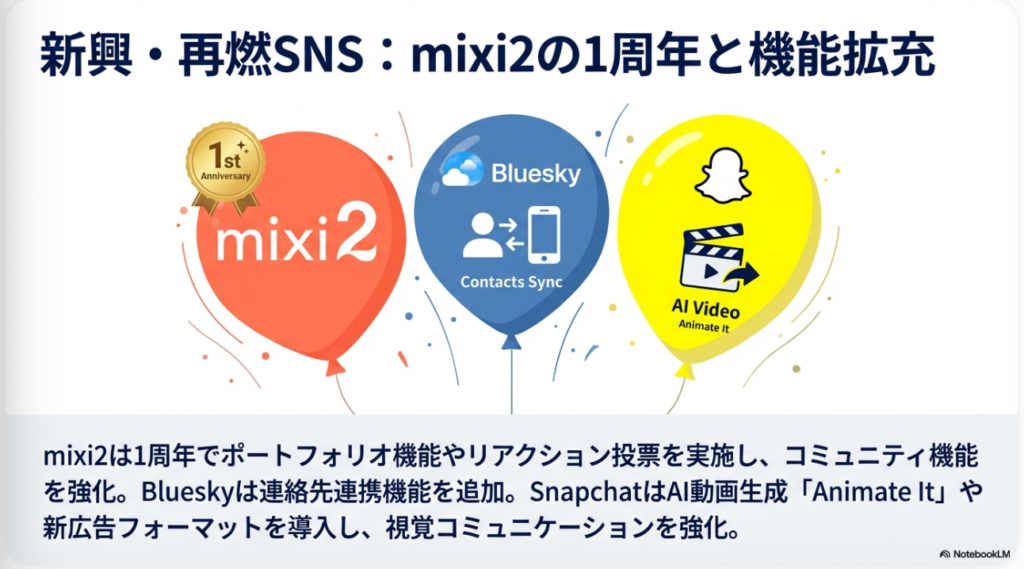 Eightもないんですが、名刺アプリ「Eight」、個人向け名刺アプリ市場で3年連続利用率No.1を獲得したってことで、まあこれ揺るがない感じになってきましたね。Eightも必須ですね、名刺管理としてですね。そしてmixi2なんですが、SNS「mixi2」サービス開始1周年&年末年始施策を展開になったりとかしていて、一応まもなくなんですがポートフォリオってね、追加になったらもしかしたら動画で解説するかもしれません。mixi2、コミュニティタブをリニューアル。mixi2、創作活動をされる皆さまが安心して利用できる生成AIに対するポリシー公開。mixi2「興味のあるカテゴリー」が設定可能に。