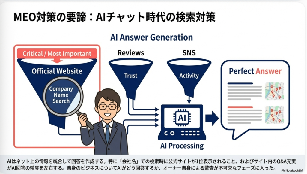 A3: Gemini搭載により「この場所についてマップに質問する」機能が追加されたことは、MEO対策において非常に重要です。ユーザーがAIに質問する形で情報を得るようになるため、ビジネスプロフィールの情報を充実させることがこれまで以上に重要になります。具体的には、営業時間、サービス内容、料金、設備情報などを正確かつ詳細に記載すること、高品質な写真や動画を投稿すること、そしてレビューへの丁寧な返信を心がけることが推奨されます。また、人気度がランキング要因に加わったため、実際の来店客数や評価を高める施策も重要になっています。